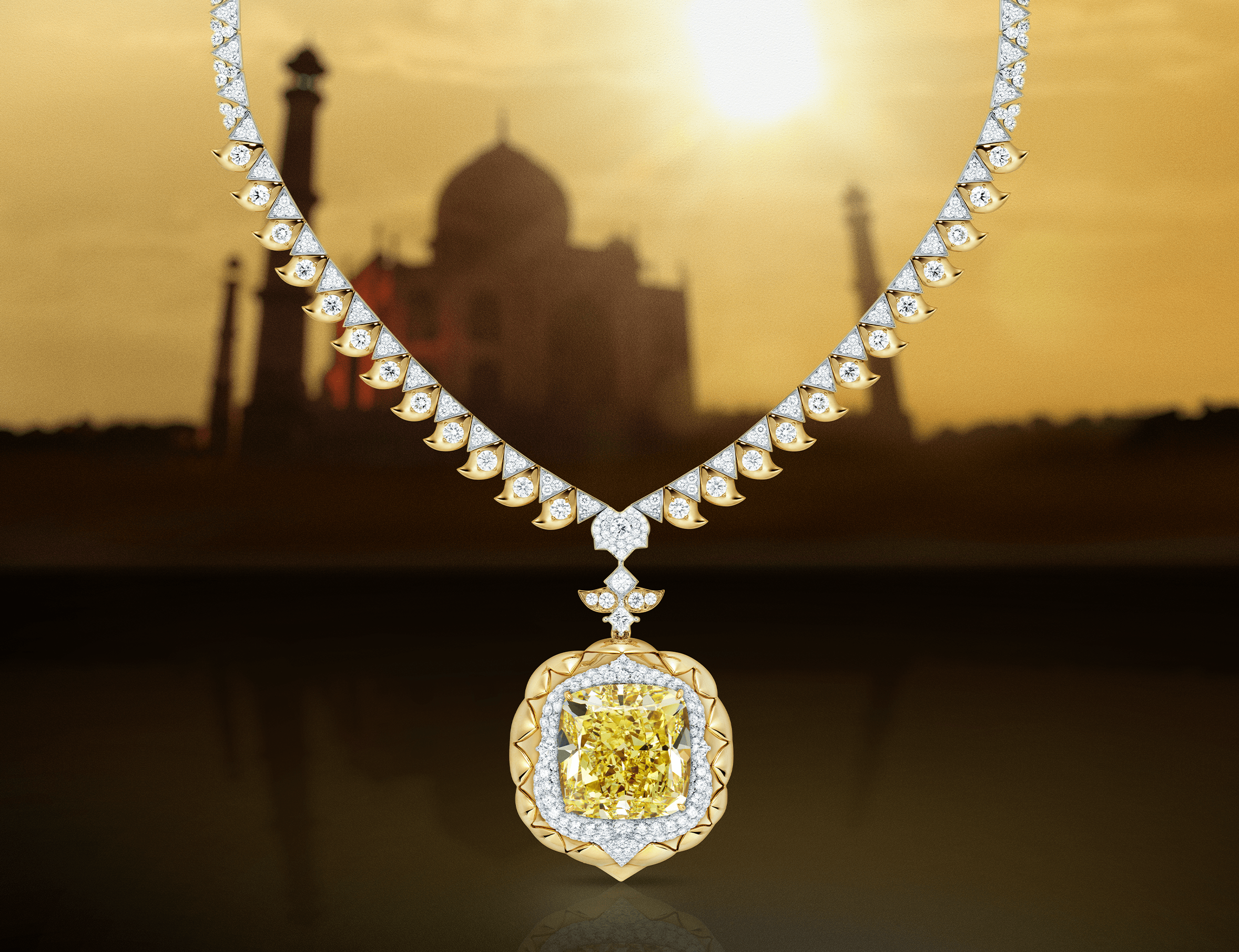 من روح الحبّ الخالد الذي أبدع تاج محل، وُلد هذا التصميم الآسر ليجسّد الانسجام والعاطفة الأبدية. يتوهّج الألماس الأصفر كبزوغ الشمس في قلب القلادة، تعبيرًا عن الدفء والإخلاص اللذين خُلّدا في التاريخ. ومع أكثر من 600 ساعة من الحرفية الدقيقة، يمكن تحوّل هذا الإبداع من قلادة إلى بروش متألّق أيضاً.